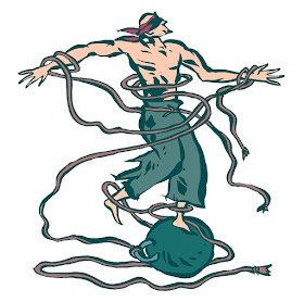 Sous l'effet des gigotements incessants, aux inégales variations, aux piqures et démangeaisons dus aux moustiques, puces et autres peuplades, cavaliers malins dont j'étais le porteur suprême ou sans doute tout autant sous l'effet euphorisant d'une sorte de rêve et, peut-être, quelque peu en conséquence du récit que je parvenais, lambeaux par lambeaux, non sans peine à réunir, les cordes qui m'attachaient se déliaient. Sans un mot, les deux bras qui eux aussi m'entravaient me lâchèrent et, m'a-t'il semblé... ou, me l'a-t'on raconté par la suite, m'enlevèrent le bandeau que je croyais avoir sur les yeux. Automatiquement, du dedans, mes deux bras s’étaient ouverts comme pour accueillir un hypothétique équilibre, mes jambes, sans que ma volonté ne n'y soit pour quelque chose, se plient et mon regard comme un phare dans la nuit cherche au loin un point d’appui. Du dehors, sans que je puisse le savoir, il n'en était rien. Sur mon visage un sourire, de lui-même, de circonstance peut-être... s'était installé. Combien était-il trompeur... cela aussi, je ne le saurai sans doute jamais... En lui se reflétaient dans une sorte d'éloignement ordonné nombre de fantômes qui eux aussi souriaient obéissant à la très rigide, ancestrale et contraignante règle du savoir bien-vivre. Un large bandeau rouge à nouveau me recouvrait les yeux.